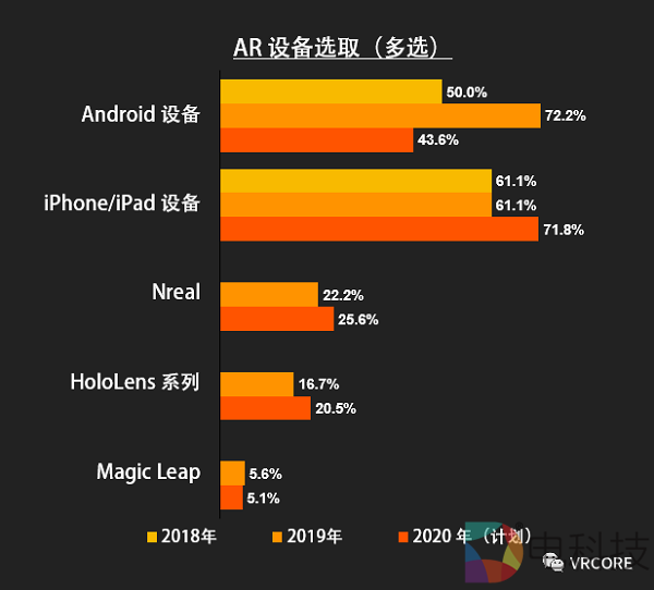 从团队选择的AR设备来看,相对成熟的手持式设备(Android 设备和苹果设备)目前是 AR 内容开发者的主要阵地。这一类设备的庞大基础能够为开发者提供更广阔的市场。