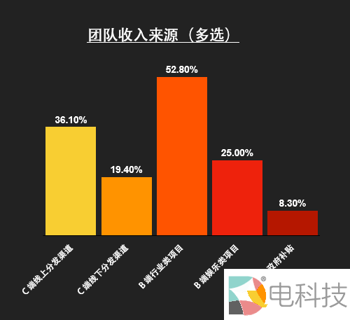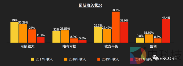 在收入方面比较来看,2019年,有接近6成的团队实现了收支平衡,是近年来新高,无法实现自我造血、获取稳定业务的团队被大规模淘汰,但同时获取盈利的团队比例有所下降。