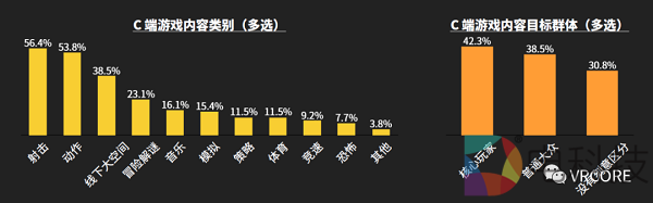 其中在C端游戏内容的类别中,射击类和动作类依然稳定的位于前两位;因为提供线下大空间游戏体验的线下店在 2019 年急速扩张,有 4 成团队尝试研发线下大空间游戏;目前,依然有相当数量(30.8%)的游戏没有对游戏目标群体进行区分。