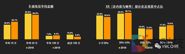 从B端项目金额上来看,XR项目金额依然较小,并且同2018年相比略有下降;从项目整体来看,XR部分在大多数项目中不占主体部分,仅有3成左右的项目XR 部分预算超过总预算的 50%;更多的项目中,XR部分还是作为多媒体中的一种存在。