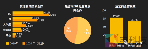 随着运营商的入局,内容开发者同运营就 5G 技术展开了广泛合作。2019 年已经有接近一半的开发者同运营商展开合作,主要的合作是内容登陆运营商平台,其中主要是通过原有内容移植,协助运营商完成内容的迅速扩充。