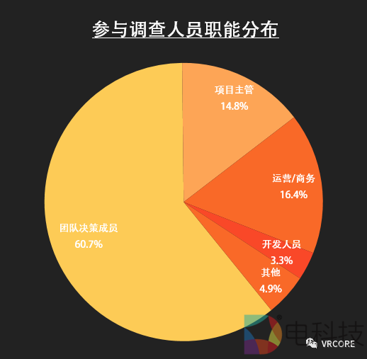 为了向整个行业更直观的展示过去一年内容开发者的面貌及对新一年的规划,VRCORE 在 2020 年 4 月进行了问卷调查。参与调查的人员中,团队决策者占到了60.7%,基本代表了目前国内VR内容研发团队的整体面貌与发展趋势。