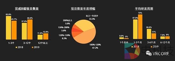 B端方面,整体来看,团队在2019年的接单量有所提升。只有3 成左右的团队在2019年出现了项目数量下降的情况;同时,团队项目的研发周期也在缩短,研发周期在3 个月以内的项目占比达到了 75%。