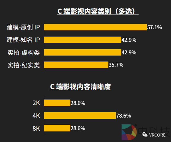 C 端影视内容中,目前各品类间区别不大;影视内容清晰度主要以 4K 为主,是目前主流的硬件设备能够支持的清晰度。随着硬件的更迭,未来影视类内容的清晰度也势必会同步增长。