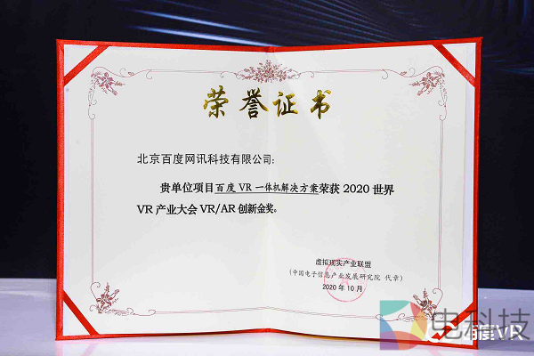 (10月19日,2020世界VR产业大会,百度VR一体机解决方案荣获大会“AR/VR创新金奖”)