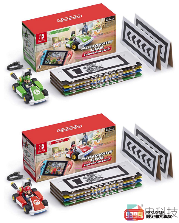 《马里奥赛车Live:家庭巡回赛》的游戏套装里包含了一辆马里奥或者路易吉遥控赛车、一根USB-C转USB-A的充电线、两个指示方向用的纸板(可以在游戏中通过AR动画来提示转弯方向)、四个折叠纸板门(用于赛车识别赛程和起点终点)。纸板门可以放置在遥控赛车信号范围内的任何位置,需要进行固定,因为稍有扭曲就可能会让AR追踪无法识别。