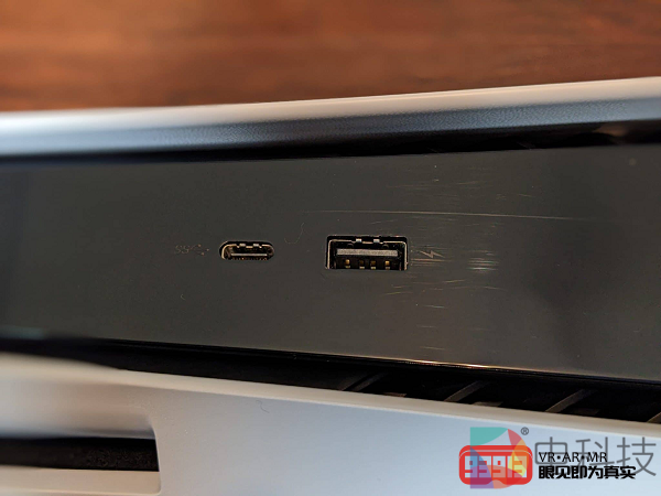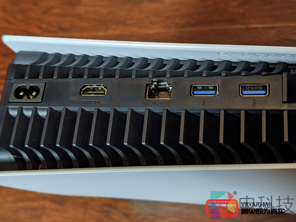 PS5主机重量较沉,背面有2个USB接口,1个HDMI接口,1个电源接口以及一个以太网接口,并没有原先PS4上用于接入PS Camera的AUX接口,因此想要使用PSVR必须使用AUX-USB的转接口,索尼目前尚未提供。
