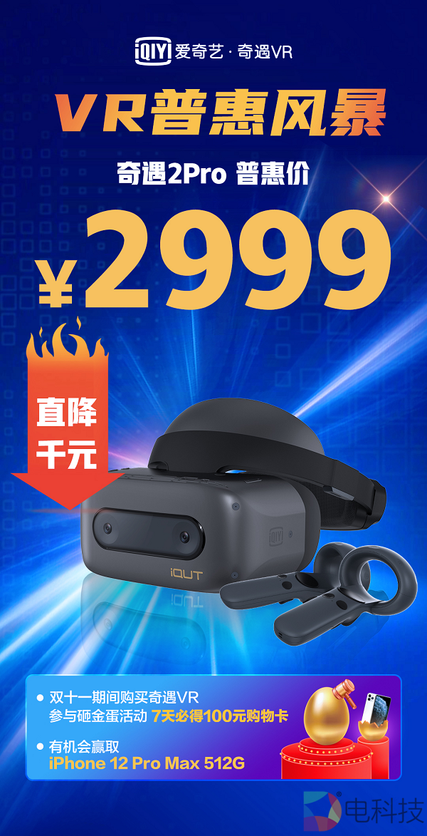 在2020京东11.11全球热爱季期间,奇遇2PRO 6DoF VR体感游戏机联合苹果组成“奇果CP”,奇遇2PRO 128G&iPAD套装原价6798元,开门红价只要4630元。而且,所有在双十一期间(11月1日-11月11日)通过天猫/京东平台购买爱奇艺奇遇VR 2PRO/2S的用户,均可在一体机内参与“奇遇双十一,金蛋赢豪礼”活动,用户不仅可以通过砸金蛋的方式获得价值100元的京东E卡/天猫超市卡,还可参加超级锦鲤活动,有机会赢取一台iPhone 12 Pro Max 512G!