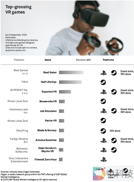 日前,标普发布了关于数字版VR游戏营收的分析报告,统计了数字版VR游戏主流渠道(Steam商店、PlayStation商店、Rift商店以及Quest商店)的销售状况。