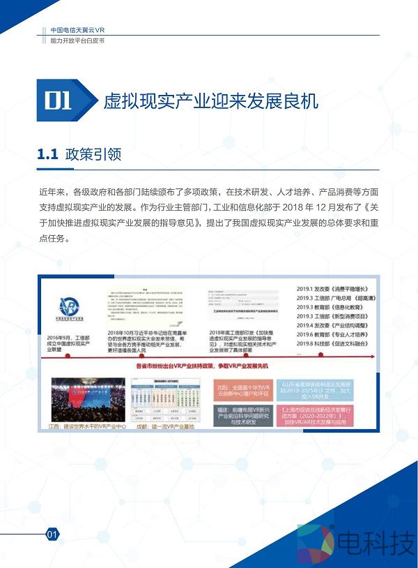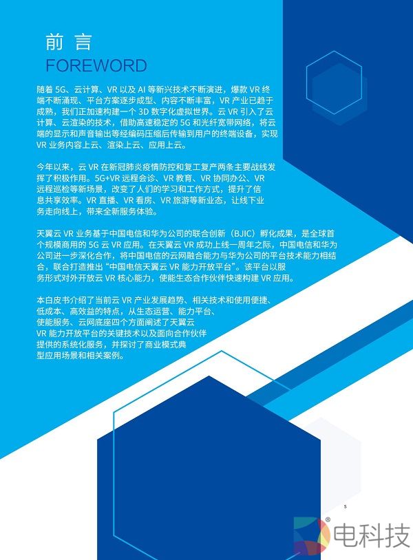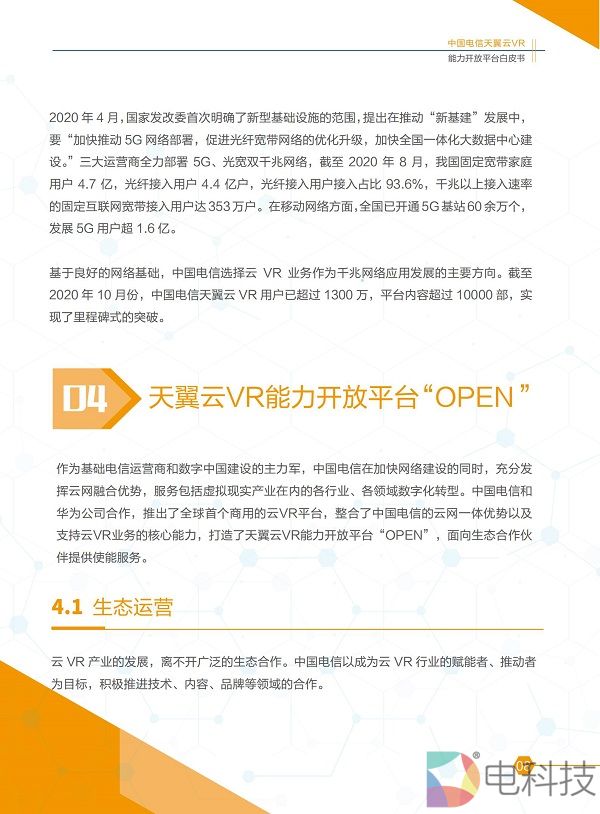 2020年11月8日,在主题为「预见·5G应用新生态」的中国电信5G+云VR论坛上,「中国电信天翼云VR能力开放平台白皮书」(2020版)正式发布。 本白皮书介绍了当前云VR产业发