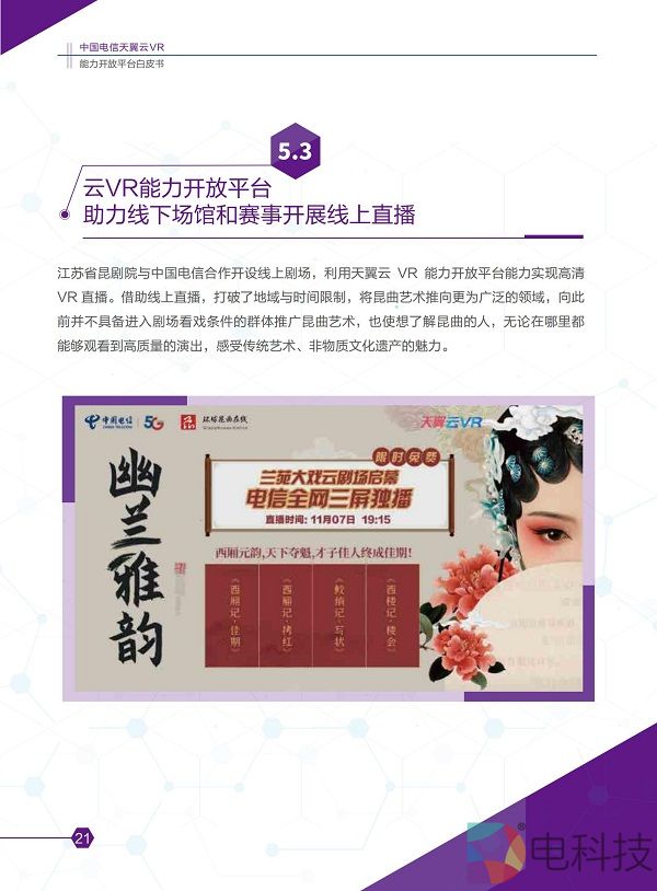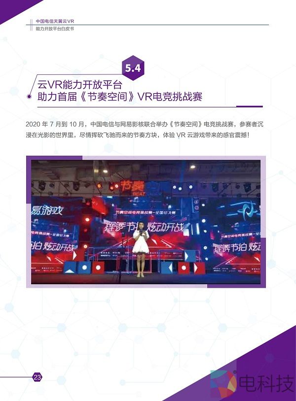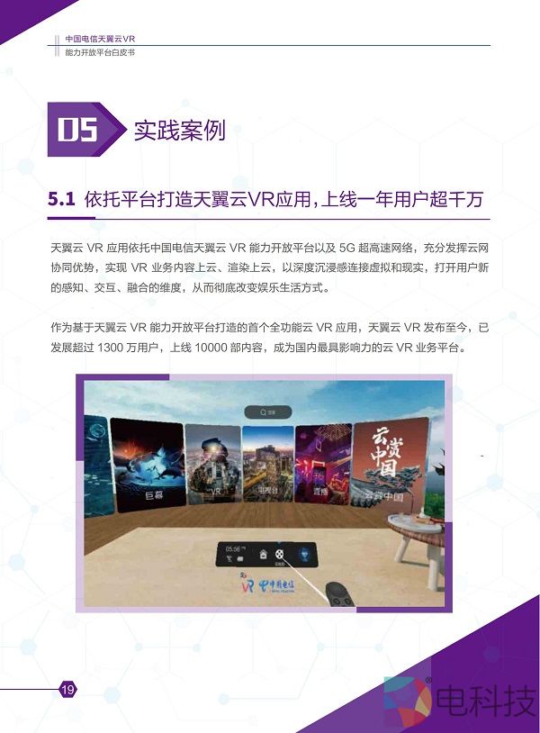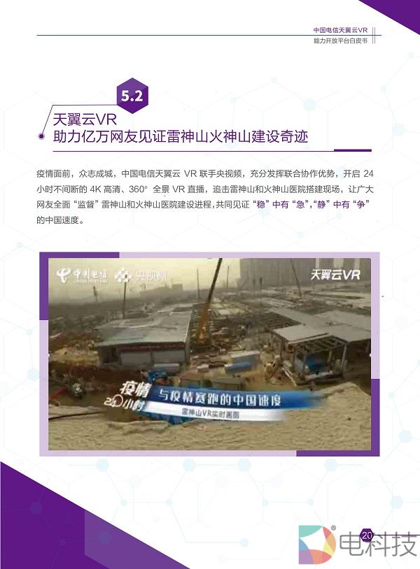 2020年11月8日,在主题为「预见·5G应用新生态」的中国电信5G+云VR论坛上,「中国电信天翼云VR能力开放平台白皮书」(2020版)正式发布。