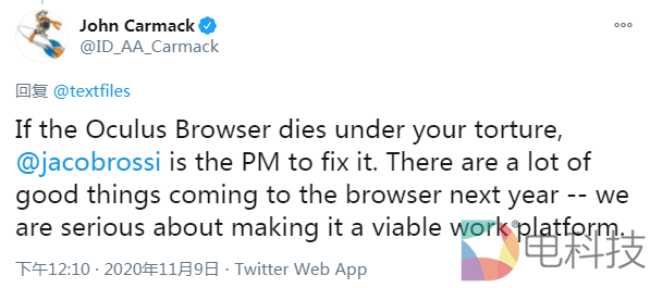 此外,从卡马克发表的关于Oculus Browser新功能的评论来看,其似乎热衷于在明年扩展Quest的多人社交及远程工作功能。