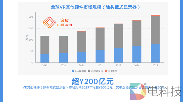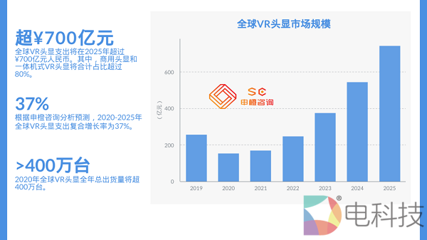 申橙咨询预测,全球VR/AR市场规模将在2025年超¥3500亿元。 其中,VR头显市场规模将超¥700亿元,2020年全球VR头显发货量将超400万台;VR其他硬件市场(非头戴式显示器)规模