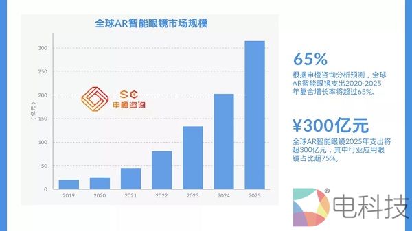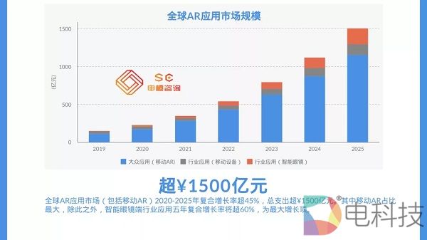 AR智能眼镜市场规模将在2025年超过¥300亿元,AR应用市场(包括移动AR大众应用,移动AR行业应用及智能眼镜端行业应用)市场规模将超过¥1500亿元。