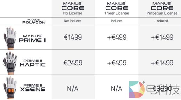 首先,入门级Manus Prime II手套现已降至1499欧元;其次,Prime II Haptic版本售价为2499欧元;最后,包含了Manus Core软件的Prime II XSens版本则售价3990欧元。
