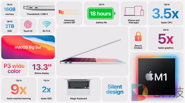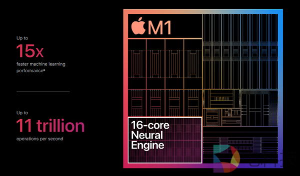 M1同样搭载了Nerual Engine来强化其机器学习的能力。M1的Nerual Engine拥有16个核心,每秒可进行11万亿次操作,相比前代MAC笔记本,机器学习的运算性能提升高达15倍。