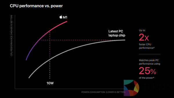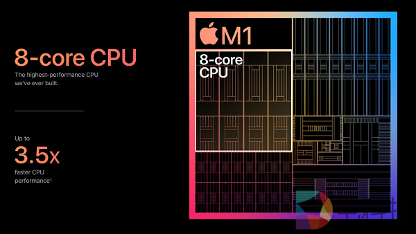 M1拥有8核心CPU,其中4个核心为高性能核心,4个核心为高效率核心,功耗仅10W。苹果官方给出的数据是,M1与最新的笔记本电脑CPU相比性能可达后者2倍,而在笔记本CPU峰值性能下,M1的功耗仅为后者的1/4。