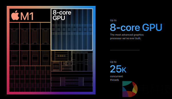 在GPU方面,M1配备了8核GPU,苹果称其为世界上性能最强的PC集成显卡,拥有128个执行单元,可同时执行24576个线程,运算能力达到2.6TFLOPs,仅就运算能力来说已经超越了英伟达的GTX970(2.44TFLOPs),Pixel Fillrate达到41G/S,Texel Fillrate为82G/S。