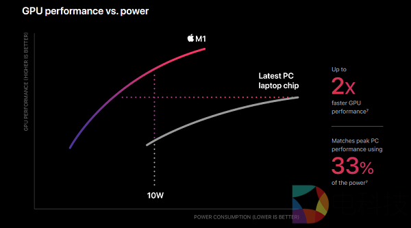 M1 GPU额定功率同样是10W,相比其他最新的笔记本集成显卡,性能可达后者的两倍,如果工作在与笔记本集成显卡相同的峰值性能下,M1功耗仅有后者的1/3。