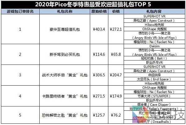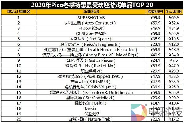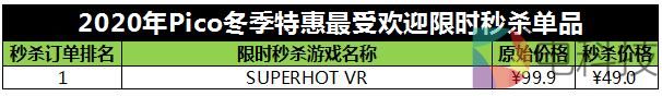 Pico 2020冬季特惠活动已于11.15 24:00正式结束,该活动从11月5日启动,整体分为三个部分:1)50款精品6DoF游戏单品低至三折起; 2)15个超值特惠礼包低至五折起发售;3)更有《SUPERHOT VR》、《异构之巅(Apex Construct)》等5款平台大热游戏以超低价格进行限时秒杀。