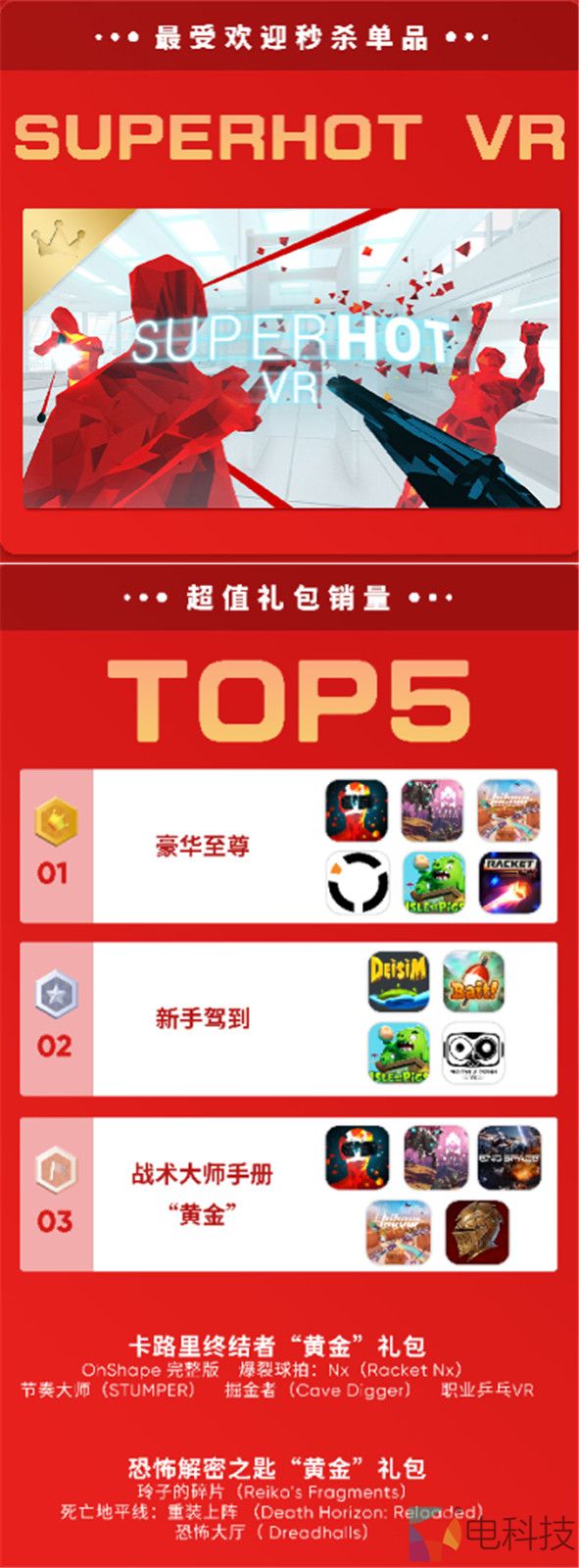 目前从官方披露数据来看,本次冬季特惠游戏最受欢迎单品及最受欢迎秒杀单品均为《SUPERHOT VR》;最受欢迎超值礼包为豪华至尊超值礼包,内含《SUPERHOT VR》、《异构之巅(Apex Construct)》、《Hibow抢先版》等平台大热游戏。