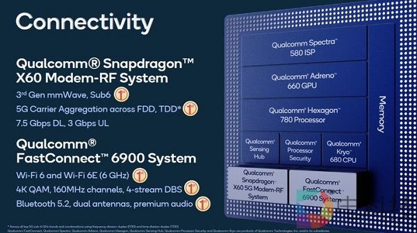 本代骁龙 888 在旗舰芯片上采用了集成 5G 基带,它集成了高通的第三代 5G 调制解调器及射频系统——骁龙 X60 ,同时支持 5G 毫米波和 Sub-6 GHz 频段,真正地做到了 5G 全网通。另外得益于 5nm 的先进制程工艺,预计明年搭载这款 SoC 的 Android 旗舰在 5G 功耗上会表现得更好一些,续航会更久一点。