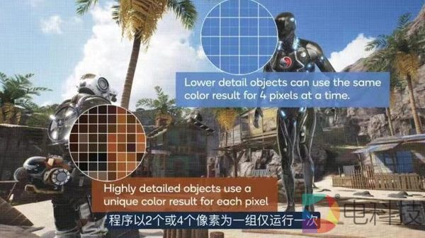 之前的骁龙 865 带来了 GPU 驱动更新、端游级正向渲染等端游级特性,现在骁龙 888 支持的第三代 Snapdragon Elite Gaming 又给移动端带来了另一个重要的端游级特性——可变分辨率渲染(Variable Rate Shading),骁龙 888 也是首款在移动端支持可变分辨率渲染的移动平台。使用可变分辨率渲染之后,游戏整体性能最多可提高 30%。这样可以使游戏运行更流畅,此外还能以更低的功耗运行更长时间。它还将为游戏开发人员提供更大的创作空间,以充分利用硬件,为移动游戏创作提供更大型,更独特的体验。