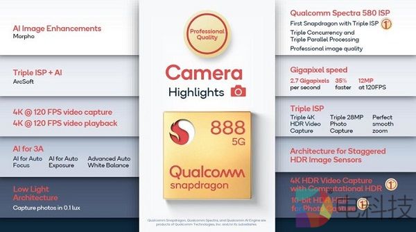 在骁龙 888 上,它对于拍摄能力的支持也到了全新的高度,其中最关键的就是 3 个 ISP(Image Signal Processor,图像信号处理器)的加入,这是 Qualcomm Spectra 首次支持 3 个 ISP。