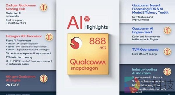 前面在讲骁龙 888 如何让手机拍摄更强大的时候,着重提到了它的 AI 能力,实际上,这一次骁龙 888 在 AI 性能上的提升幅度是空前的:现在它能实现每秒 26 万亿次运算(26 TOPS)的强大算力,并且每瓦特性能较前代平台提升高达 3 倍。