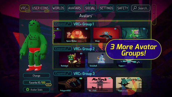 成为VRChat Plus会员,用户将能自定义用户图标以打造个性化VRC铭牌,该高能功能支持用户保存64个自定义图标以及进行分享交换。此外,会员用户还拥有100个头像保存空间(免费用户仅25个),以供用户随时展示及收藏喜爱的个性化头像。