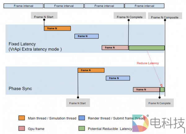 与固定延迟模式相比,「相位同步」会根据应用程序的工作量自适应地处理帧定时。目的是使帧恰好在合成器需要完整画面帧之前完成渲染,这样可以尽可能多的降低延迟,并且也不会导致任何帧丢失。下图显示了典型的多线程VR应用程序上的「相位同步」和固定延迟模式之间的差异。