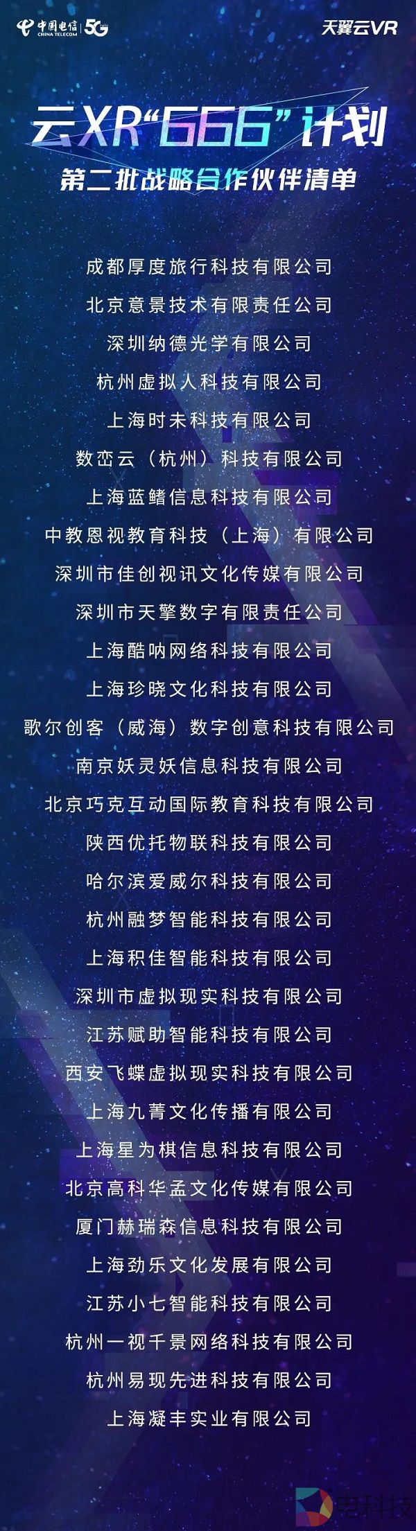 2020年10月20日,中国电信天翼云VR于江西南昌VR大会正式公布云XR“666”战略;11月8日,中国电信天翼云VR在天翼智能博览会5G+云VR论坛上,正式对外公布并签约云XR“666”计划首批战略合作伙伴共计55家,涵盖了硬件、软件、内容、服务等全产业链多个领域;12月11日,云XR“666”计划第二批31家战略合作伙伴名单也正式公布。