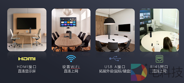 Kandao Meeting Pro机身自带多种接口,包括WiFi、RJ45网口、HDMI、USB type-A/type-C等,只需要将其放置会议桌上,并根据需要接入相应设备,就能快速部署成多种类型的视频会议解决方案,灵活适配多种办公空间。