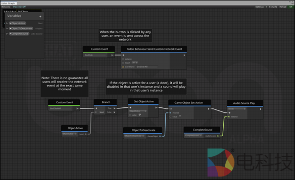 在VRChat世界中有三种同步方法。VRChat平台为开发人员提供了一种简便的方法来创建对象:将预制脚本附加到对象上,从而可以在虚拟世界中拾取和移动对象,但该平台还通过其Udon流程图脚本系统提供了更复杂的交互功能。同步Udon脚本高级功能需要使用以下两种方法之一:事件调用或变量同步。