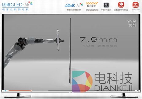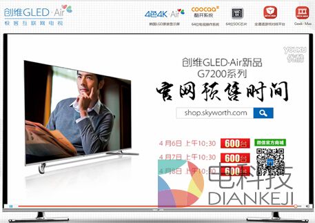 4月5日,创维GLEDAir族系新品G7200在国内最大的视频网站优酷举行线上发布会,创维在全国的两万余家商场门店同步播出,是行业内首家举行线上发布会的彩电厂商。