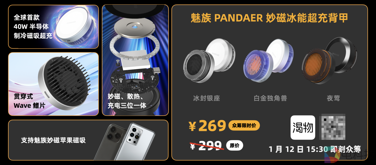 作为魅族首款“物理外挂”,魅族 PANDAER 妙磁冰能快充背甲系列不仅有着强悍的制冷散热能力,还支持 10N 磁力的磁吸以及多品牌适配的无线快充功能。魅族 PANDAER 40W 妙磁冰能超充背甲即刻开启众筹,众筹价 269 元;15W 魅族 PANDAER 妙磁冰能闪充背甲售价 269 元,将于年后上线。