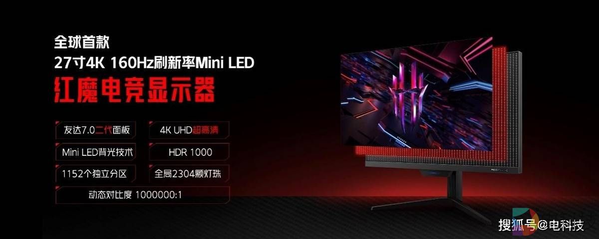 红魔电竞显示器是全行业首款27英寸4K 160Hz MiniLED显示器,同时也是全行业首款自带毫米波无线投屏技术的显示器,搭载27英寸大屏幕,4K UHD超高清分辨率,178°超广视角;作为行业首款友达光电7.0面板的MiniLED显示器,内置多达2304颗MiniLED灯珠,支持1152个独立分区智能分区控光;同时还支持160Hz超高刷新率,兼容AMD FreeSync和NVIDIA G-Sync两大显卡厂商显示变频技术,游戏更极致流畅!全域广色域覆盖精准还原3A大作色彩,完美兼顾游戏与设计创作需求。