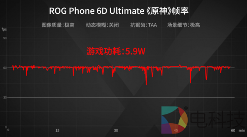 测游戏当然不能离开《原神》,在一小时的跑图、打怪中,它的平均帧率达到了60.2,游戏功率为5.9W。《原神》接近满帧的手机常见,但超过60帧还是第一次见到。这也很好理解,毕竟性能都这么强了,再随随便便多渲染一点画面出来让你们体验到稳定的满血60Hz有啥不好?