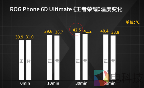 一小时内发热情况如下,温度最高时出现在30分钟时的正面,为42.54℃,此时系统对性能进行调整,一小时时温度最高仅有40.42℃,游戏体验并没有受到影响。