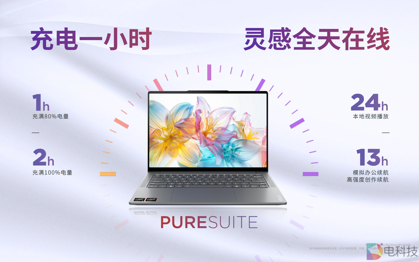 续航方面,得益于新一代英特尔酷睿Ultra处理器与联想独有的灵境引擎省电算法,YOGA Air 15可全天候陪伴用户,支持日常办公使用约13小时、最高可支持24小时的本地视频播放。不仅续航持久,YOGA Air 15还支持快速充电,仅用一个小时就可以充到80%的电量;而将电量充至100%,也只需两个小时。
