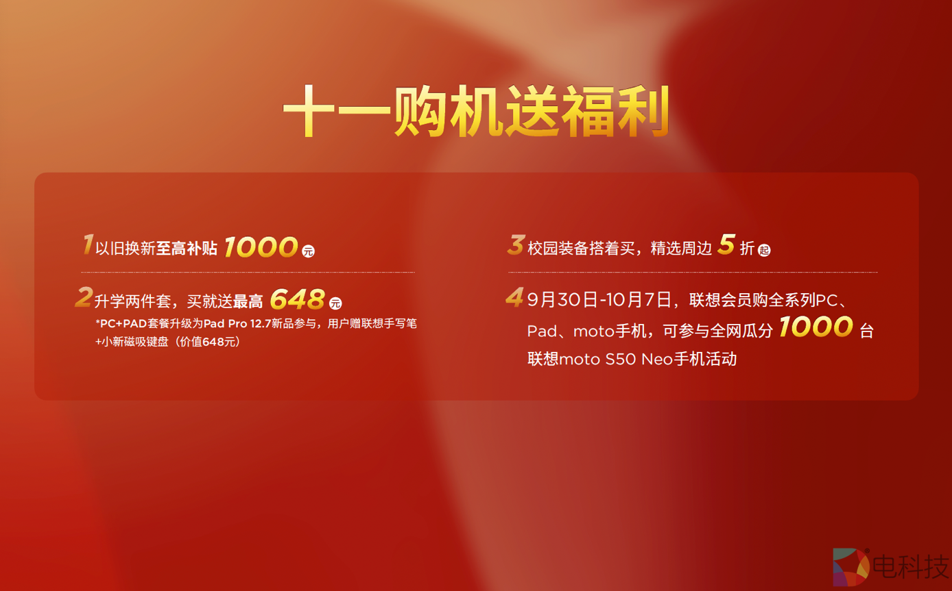 联想还推出了包含购机抽奖、以旧换新、套装优惠等在内的一系列国庆福利政策。9月30日至10月7日,包括此次发布的三款新品在内,联想会员购买PC、平板、联想moto手机、显示器,都可参与全网瓜分1000台联想moto S50 Neo手机的活动。联想以旧换新至高补贴1000元。此外,联想还为新入学的同学准备了PC+平板“升学两件套”,其中平板升级为小新Pad Pro 12.7新品,购买就送价值648元的联想手写笔+小新磁吸键盘。校园装备搭着买,精选周边统统5折起。