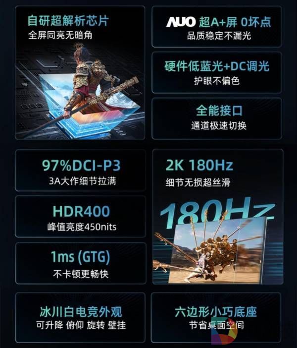 其他功能方面,大圣G5 Pro采用硬件低蓝光护眼加DC调光的双重防护,不偏色的同时,从源头达成护眼。2K 180Hz高刷新率屏、1ms GTG疾速响应;全能接口满血连接,各通道接口信号均支持快速切换,让玩家尽情畅享丝滑游戏体验。