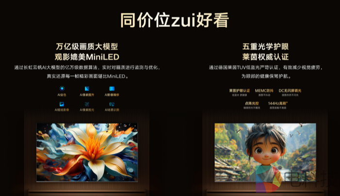 这是一款同价位最高光的艺术MiniLED电视。U7H Mini启用双倍拓宽超导光学基座,结合AI控温程序,实现了4000nits的超高峰值亮度;2800个背光分区精密把控明暗细节,使明亮之处绚烂夺目,阴暗之处深邃幽谧。