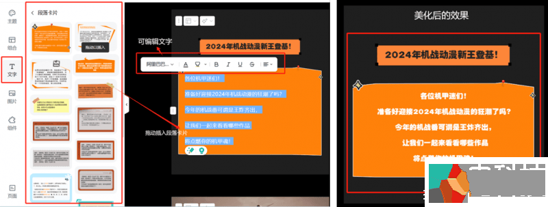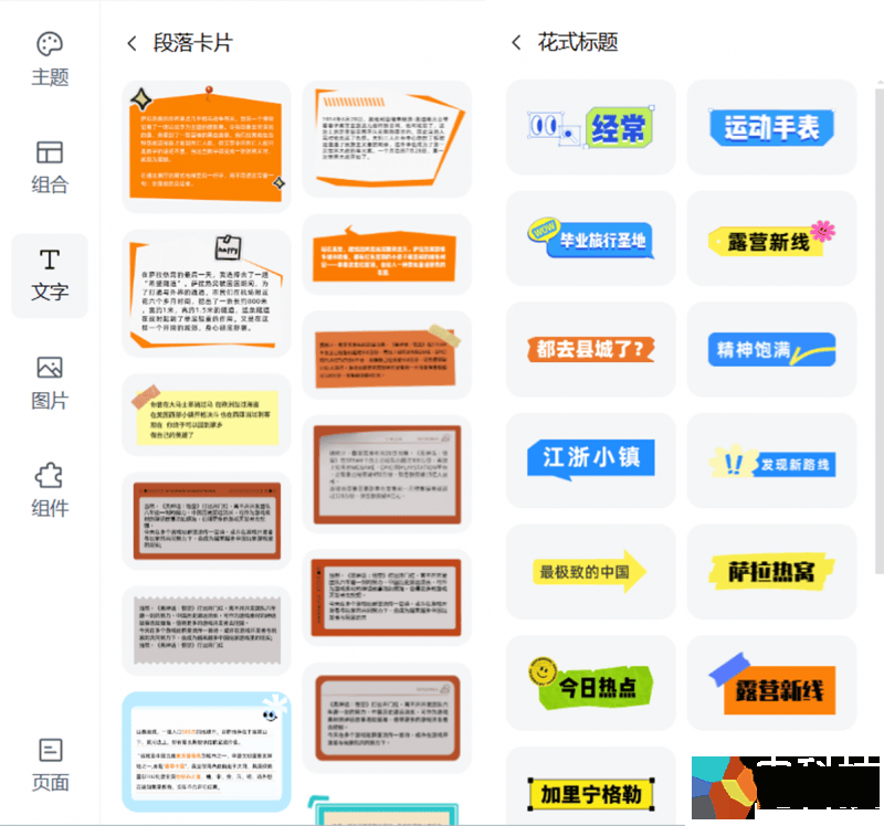 (4)文字:除去丰富的字体版本外,还支持297个花式标题、268个段落卡片,支持一键拖拽到页面,用来美化文本内容的排版。
