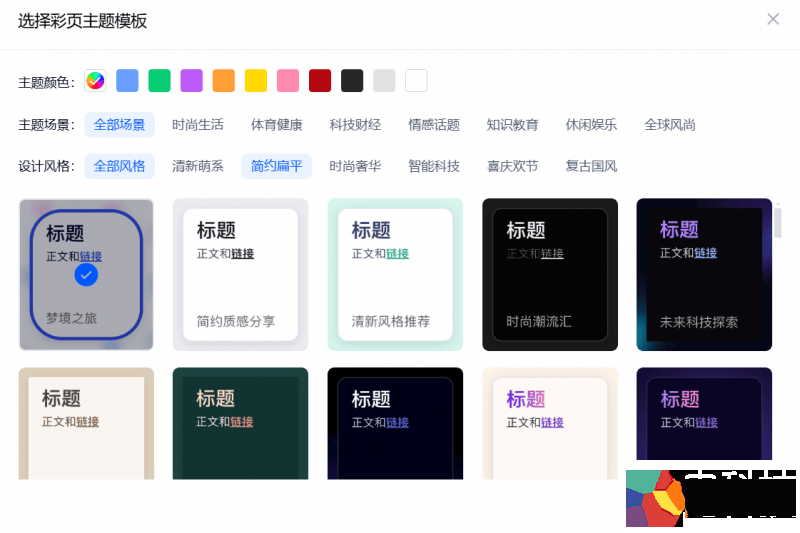 (1)主题模版:确定彩页的整体色调和风格,支持一键换模板,70个不同风格的主题模版为用户提供多样化的选择,满足不同风格的创作需求。