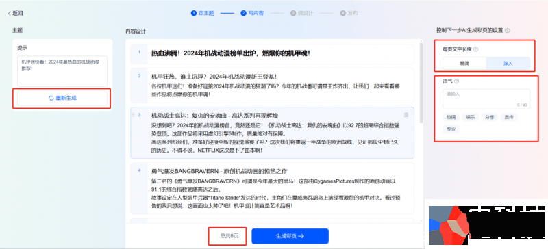 AI自动整合全网信息生成彩页大纲,并支持一键调整大纲,比如主题、页数增减,以及每页的文字长度、语气等,非常人性化!
