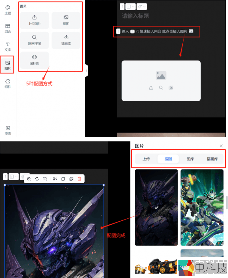 (5)图片:支持上传和搜图功能,同时还有插画和图标提供,为彩页增添丰富的视觉元素。