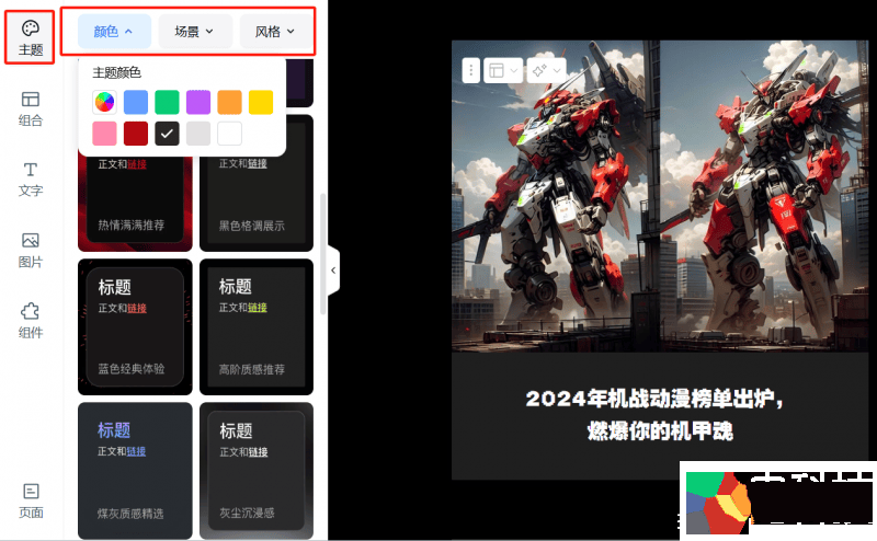 天工AI 彩页编辑器拥有强大的工具属性,支持主题、页面、组合、文字、图片、组件六大功能板块,用户可自由组合设计素材,尝试不同风格的排版。