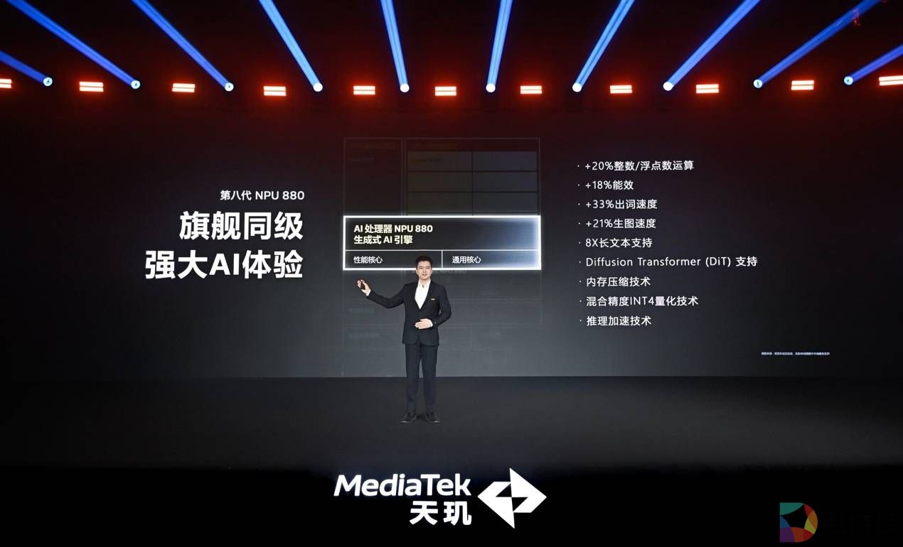天玑 8400在AI性能上的表现同样让人惊艳,它搭载了新一代旗舰AI处理器NPU 880,相比上一代,大语言模型处理速度提升33%,长文本处理能力提升8倍,图片生成速度也提升了21%。这一系列先进的旗舰级AI 技术,将加速端侧AI智慧体验加速向主流市场普及。