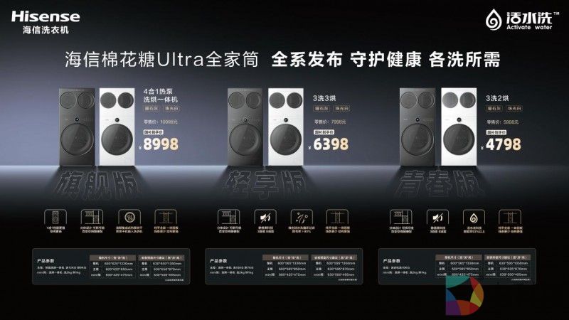 青春版,专为年轻用户及烘干需求并不强烈的用户群体设计,主筒为10kg大容量洗涤,mini筒分区洗烘,搭载海信专利活水洗科技,可实现软水阻垢,阻垢率达93%以上,洗衣柔软不发黄不变硬,满足用户基础的分区健康洗护需求。零售价5998元,预计享受以旧换新国补后4798元。